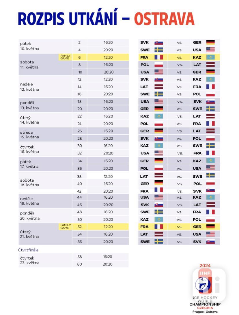 | PÁ 10. 5. (16:20) | Slovensko – Německo | Skupina A (Ostrava) |